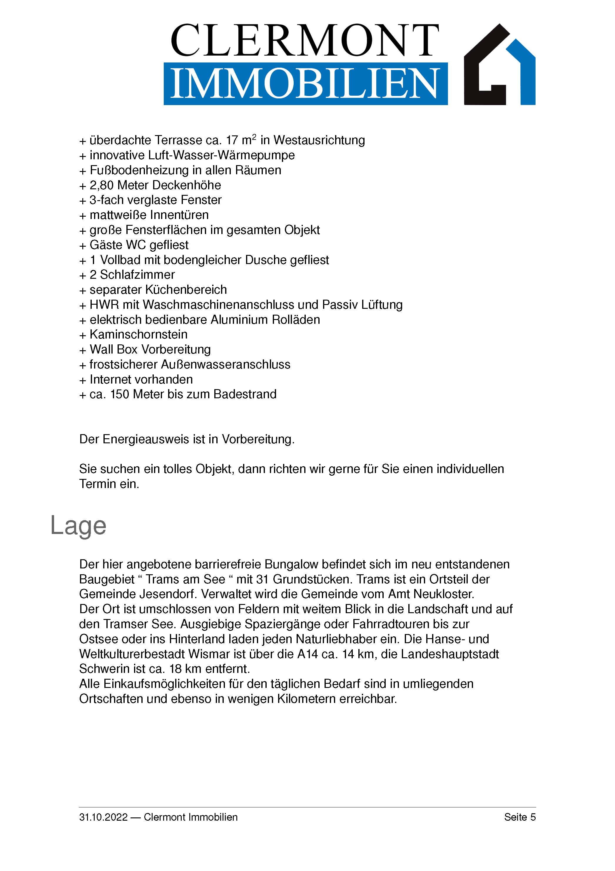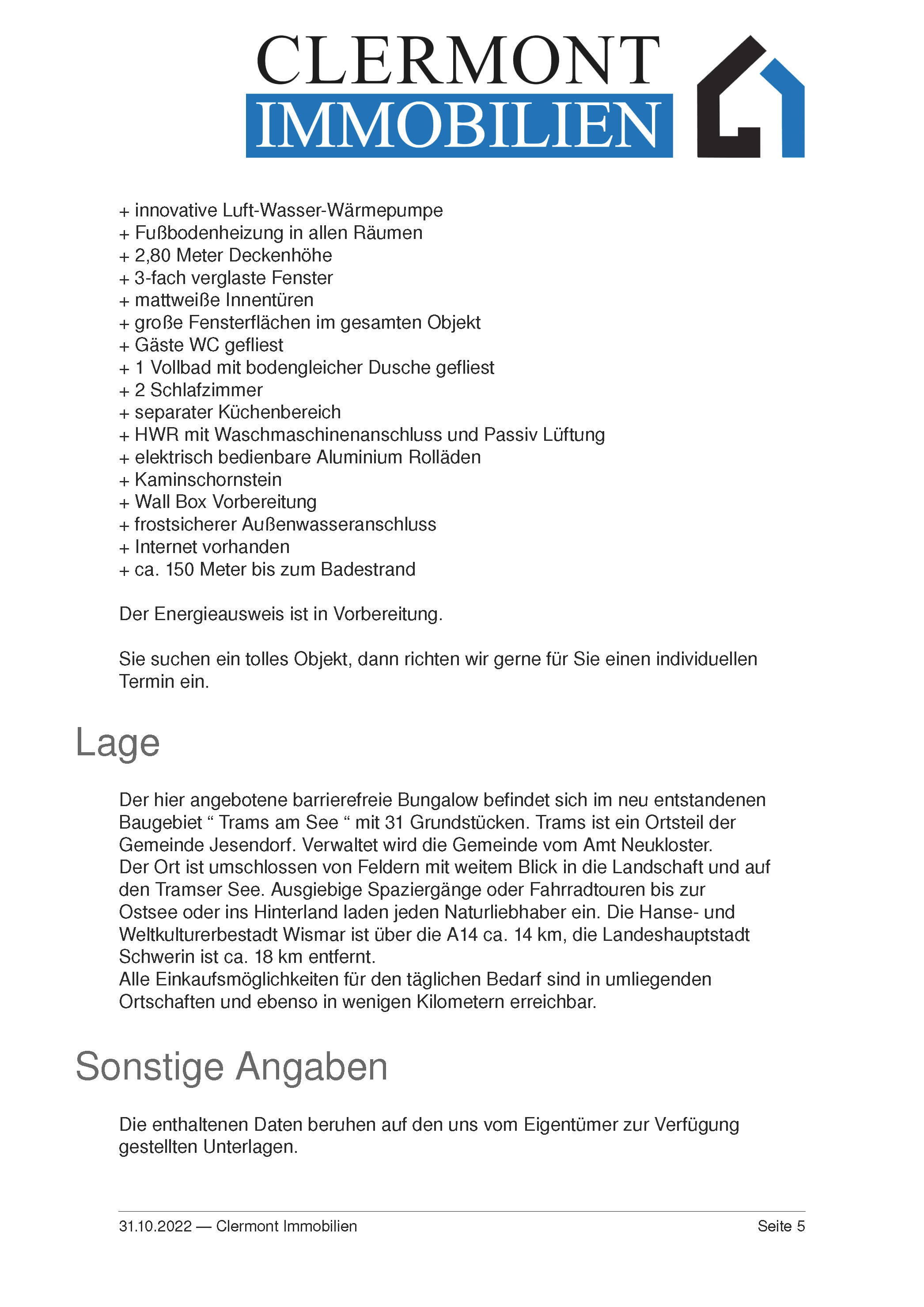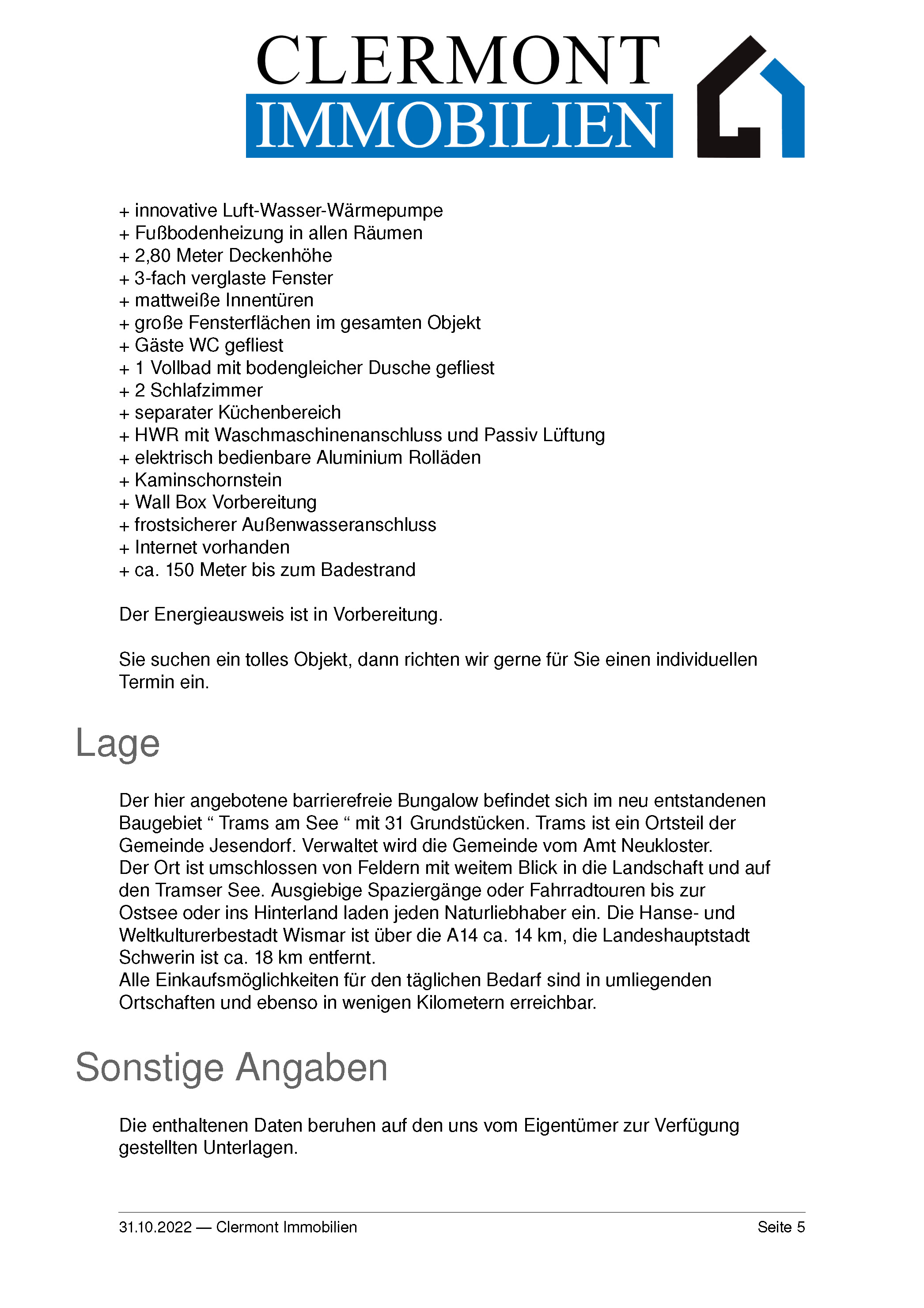 Die hier angebotenen barrierefreien Bungalows befinden sich im neu entstandenen Baugebiet "Trams am See" mit 31 Grundstücken. Trams ist ein Ortsteil der Gemeinde Jesendorf. Verwaltet wird die Gemeinde vom Amt Neukloster.